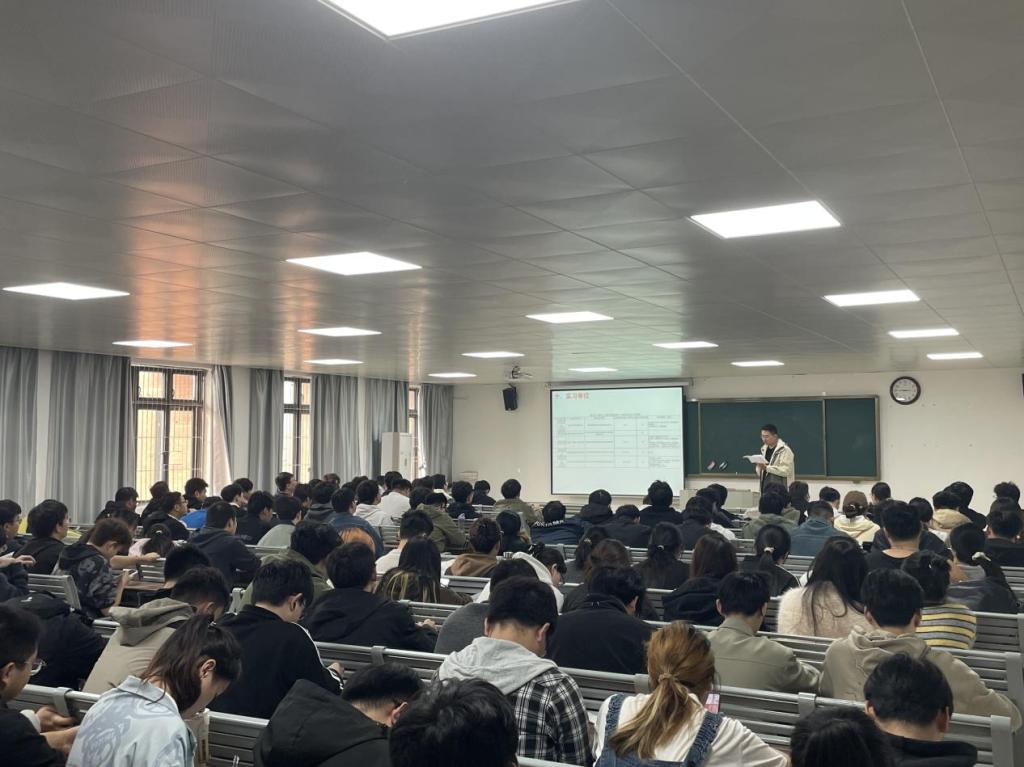 辅导员刘鸿飞老师向同学们介绍了学院合作的实习基地情况,重点讲解了各实习单位的基本福利待遇、工作内容安排以及食宿条件等。他鼓励同学们要珍惜实习机会,在实践中提升专业技能。