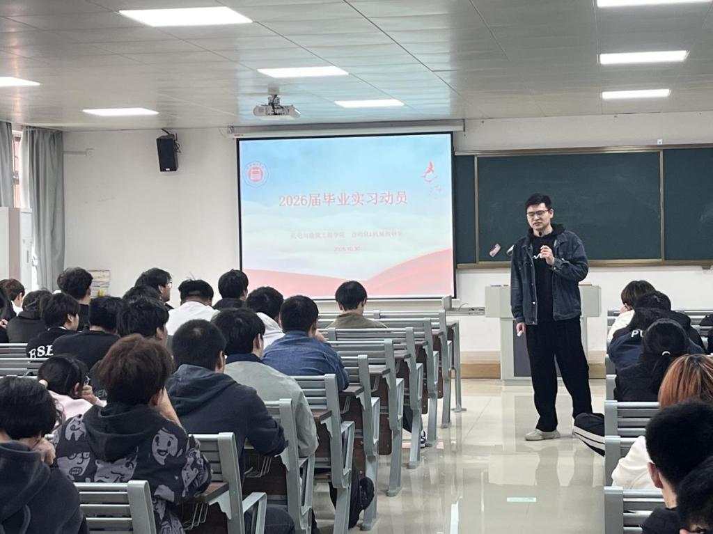 近期,beat365英国官网网站在一教320召开2026届毕业生实习动员大会,院长助理陈家乐、就业实习指导老师、毕业班辅导员及2022级自动化专业、2022级机械设计制造及其自动化专业全体学生等参加了动员大会。本次动员大会由自动化教研室主任朱鑫磊老师主持,围绕毕业实习的整体安排、具体要求及注意事项进行了全面讲解。